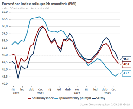 Hlavní brzdou evropské ekonomiky zůstává především zpracovatelský průmysl. Celková aktivita sice v srpnu dále neklesla, ale index setrval na velmi nízké úrovni (43,7 bodů). Hlavním problémem je nadále slabá poptávka po průmyslové produkci v prostředí rostoucích úrokových sazeb a zvýšené nejistoty. Dobrou zprávou je naopak pokračující desinflační vývoj ve zpracovatelském průmyslu, jak ostatně dokreslují i tvrdá data v podobě cen průmyslových výrobců.