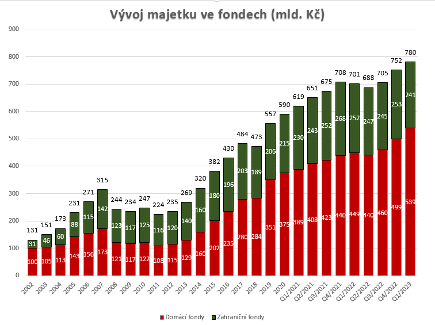 Investice do domácích a zahraničních fondů kolektivního investování nabízených v České republice dosáhly k 31. 3. 2023 výše 780 miliard Kč.