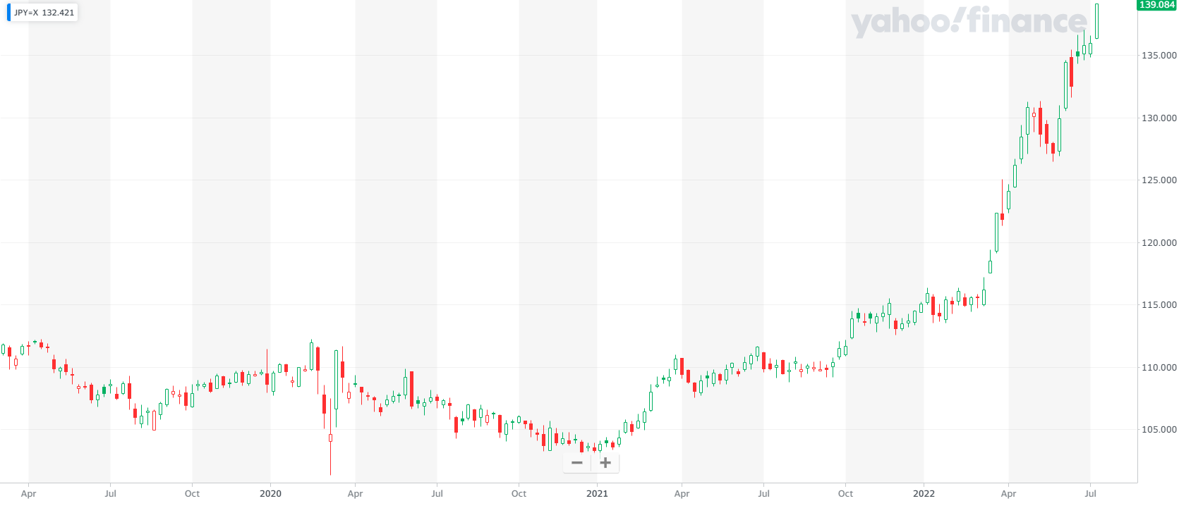 Vede to tak v odlivu kapitálu z japonského jenu do amerického dolaru. Na devizovém trhu se tak vytváří poptávka po dolaru, zatímco se tvoří nabídka jenu. Tento faktor stimuluje jen k depreciaci, zatímco dolar k apreciaci. Navíc Americký Fed podle tržních očekávání nadále zpřísní měnovou politiku, což má i například zásluhu na oslabování eura vůči dolaru. Japonský jen se k 14. 7. 2022 10:45 SEČ nachází nad hranicí 139 dolarů, viz graf. Samozřejmě mu také nepřidal nedávný atentát na expremiéra Abeho.