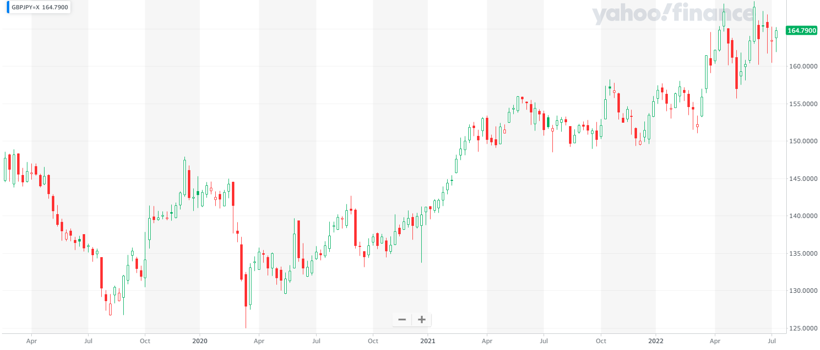 Stejná situace platí také v případě britské libry, která vůči jenu posiluje ze stejných důvodů jako dolar. Základní úroková sazba Bank of England nyní činí 1 %, což se projevuje na výnosu z 10letého státního dluhopisu Velké Británie. K 14. 7. 2022 10:45 SEČ se měnový pár GBP/JPY obchoduje za více než 164 jenů.