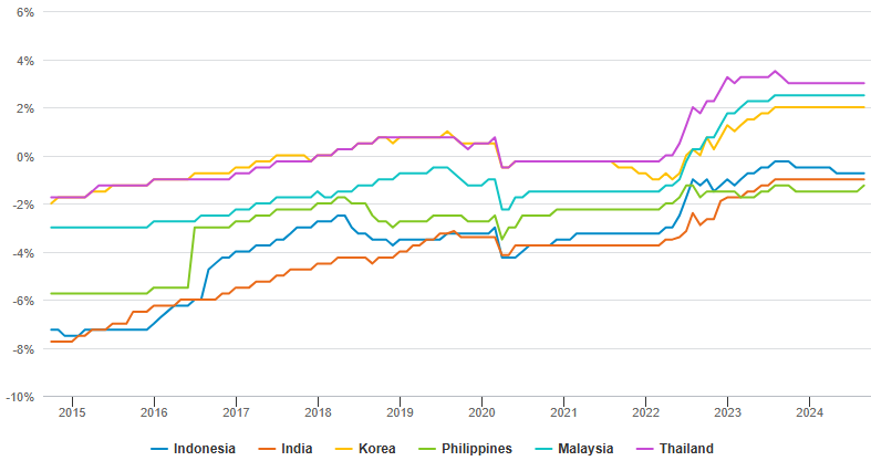 Asijské centrální banky jsou již delší dobu omezovány jestřábím postojem amerického Federálního rezervního systému. Snížením úrokových sazeb by se zvětšil rozdíl mezi nimi a USA a vzrostlo by riziko výprodeje jejich měn. Tato situace se změnila v září, kdy Fed konečně snížil úrokové sazby o 50 bazických bodů. Domníváme se, že s výjimkou Japonska bude většina asijských centrálních bank po snížení ze strany Fedu cítit, že snížení u nich také může projít. Indonésie dokonce mírně předběhla rozhodnutí Fedu a ve stejném týdnu snížila úrokové sazby o 25 bazických bodů na 6 %, což bylo její první snížení sazeb za více než tři roky.