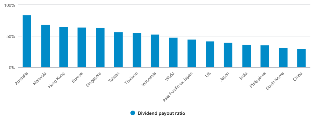Graf 1: Čína, Japonsko a Jižní Korea zaostávají ve výplatě dividend za většinou asijských zemí a celosvětovým průměrem