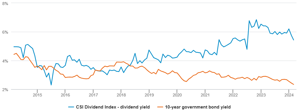 Zdroj : Wind Information, Fidelity International, duben 2024. Poznámka: Údaje jsou výnosy čínských desetiletých státních dluhopisů a klouzavé dividendové výnosy indexu CSI Dividend ke konci každého měsíce.