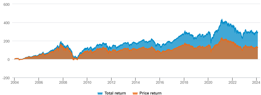 Zdroj : Bloomberg, Fidelity International, duben 2024. Poznámka: Graf ukazuje kumulativní cenový výnos a celkový výnos indexu MSCI AC Asia Pacific ex Japan od ledna 2004. Přepočteno na 0 k 1. lednu 2004. Celkový výnos se skládá ze zhodnocení ceny akcií (cenový výnos) a výnosu z dividend. Dividendový výnos tvořil 56 % celkového výnosu v letech 2004 až 2024.