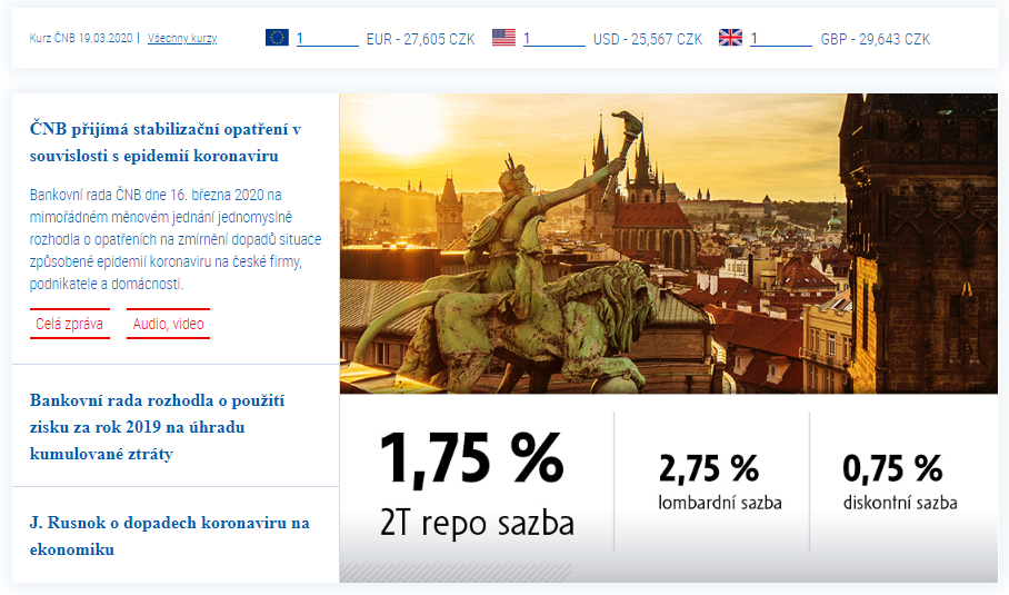 Snížení českých úrokových sazeb o půl procentního bodu se v pondělí 16. 3. 2020 stalo realitou. Komunikačním odbor naší ústřední banky věc prezentoval jako, že „ČNB přijímá stabilizační opatření v souvislosti s epidemií koronaviru.“ Bankovní rada České národní banky na mimořádném měnovém jednání snížila dvoutýdenní repo sazbu o 50 bazických bodů na 1,75 %. Současně rozhodla o snížení lombardní sazby na 2,75 % a diskontní sazby na 0,75 %. Změna sazeb byla účinná od úterý 17. března 2020.