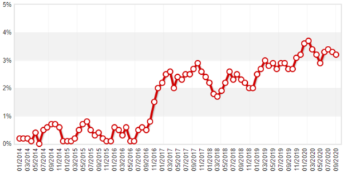 Graf 1: Neplnění 2% inflačního cíle je zřejmé delší dobu, není to jen otázkou několika měsíců. Měsíční vývoj ročního indexu spotřebitelských cen hovoří jasně.