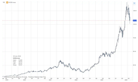 - Je humbuk kolem umělé inteligence skutečný, nebo falešný? Akcie související s umělou inteligencí byly v průběhu července slabé a slabost se zrychlila, protože velké americké technologické společnosti oznámily výrazný nárůst investic do AI. Investoři se proto ptají, zda se technologickým společnostem mohou vrátit jejich investice do umělé inteligence. Objevily se také zprávy, že Nvidia odkládá uvedení svého čipu nové generace AI s názvem Blackwill B200 na začátek příštího roku, což je další rána sentimentu kolem AI. Cena akcií společnosti Nvidia již v pátek klesla o 23 % z červnového vrcholu, protože odvětví již pravděpodobně zachytilo zprávy o zpoždění. Společnost Super Micro Computer, která je důležitou společností v ekosystému umělé inteligence, zítra oznámí výsledky hospodaření a toto zveřejnění výsledků by mohlo být pro náladu v oblasti umělé inteligence kritické. Náš názor je takový, že umělá inteligence má před sebou několik významných výzev a že investoři snižují svou expozici vůči tomuto tématu.