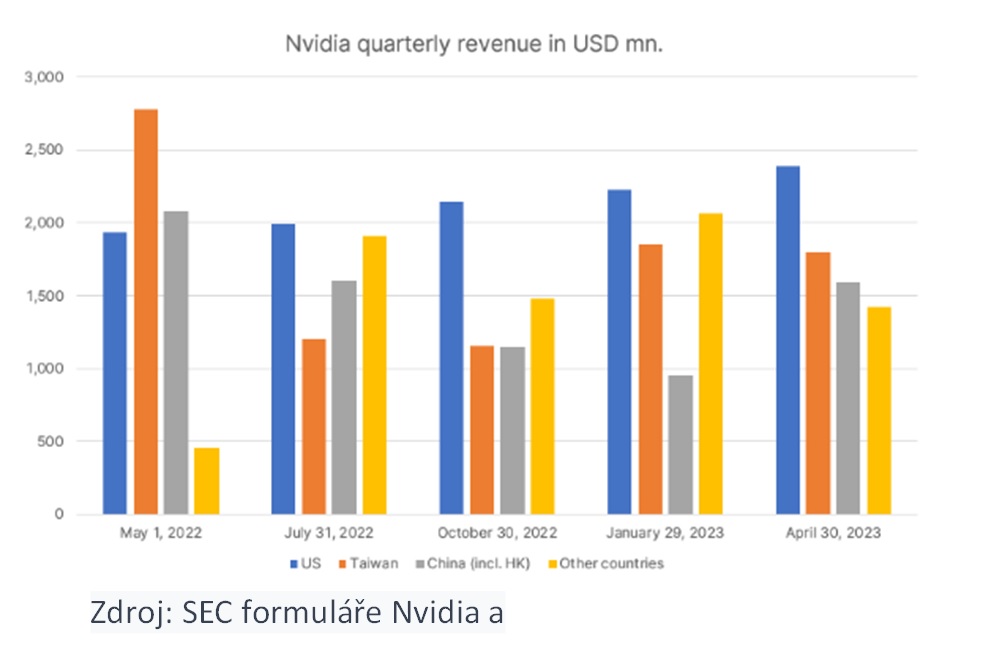 Z údajů o geografickém rozložení tržeb Nvidie vyplývá, že tou zdaleka největším hybnou silou stojící za zvýšením tržeb v 1. čtvrtletí finančního roku 24 (FY24 Q1) končícím 30. dubnem 2023 byla právě Čína. Čínské technologické firmy se totiž snaží ze všech sil dohnat své americké protějšky v oblasti AI technologií. Rozšíření exportních regulací na AI čipy tak představuje v současnosti pro extrémně optimistické výhledy Nvidie publikované v květnu dosud největší riziko, takže by teď měli investoři zvážit své expozice.