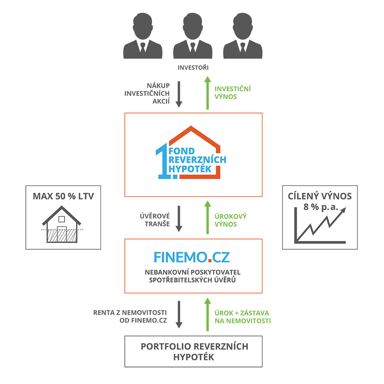 1. fond reverzních hypoték SICAV je český fond kvalifikovaných investorů založený za účelem zhodnocování prostředků investorů prostřednictvím úvěrů zajištěných portfoliem reverzních hypoték. Fond v zásadě slouží účelově k financování společnosti FINEMO.CZ SE, která je nebankovním poskytovatelem spotřebitelských úvěrů, tzv. reverzních hypoték pod obchodním názvem Renta z nemovitosti od FINEMO.CZ. Fond tedy poskytuje úvěr společnosti FINEMO.CZ, která posléze poskytuje klientům reverzní hypotéky. Tyto hypotéky jsou zajištěny nemovitostí s průměrným LTV kolem 30 – 50 %.