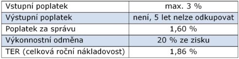 Vydává čtyři třídy investičních akcií, dvě korunové a dvě eurové, které se pak liší poplatkem za obhospodařování fondu a zároveň minimální požadovanou investicí. Třídy A1 (CZK) a B1 (EUR) mají nižší poplatek za správu 1 % ročně a jsou určeny velkým investorům s minimální investicí 740 000 euro, tj. necelých 20 milionů korun. Třídy A2 (CZK) a B2 (EUR) jsou dostupné od minimální investice 75 000 eur, tj. necelých 2 milionů korun. U třídy A2 a B2 činí poplatek za správu 1,6 % ročně. Jejich výkonnost je pak logicky zhruba o 0,6 % nižší.