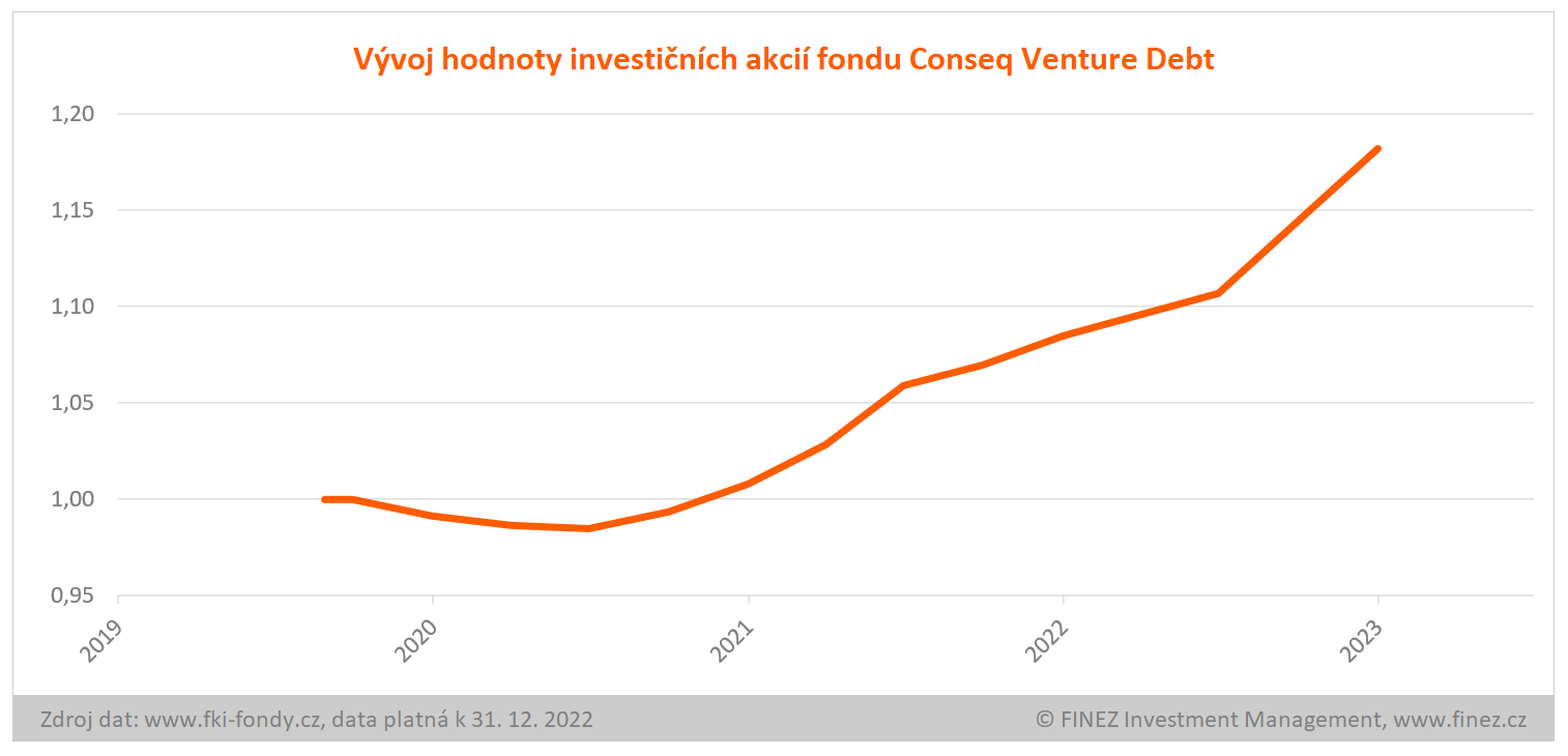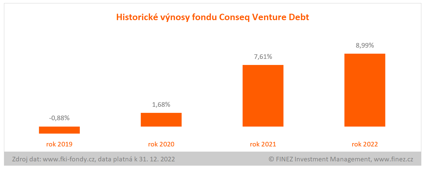 Díky vysokým úrokovým sazbám v uplynulých dvou letech výrazně vzrostly úroky u poskytnutých úvěrů, tedy i očekávané zhodnocení investičních akcií fondu. I po zohlednění všech nákladů a výkonnostní odměny by se zhodnocení u fondu Conseq Venture Debt mělo v příštích letech pohybovat kolem 10-15 % ročně.