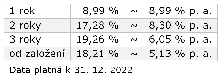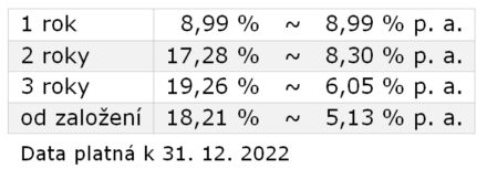 Poslední ocenění investičních akcií fondu je známé k 31. 12. 2022. V letech 2021 a 2022 už měl fond solidní zhodnocení kolem 8-9 %. Nicméně cílený čistý výnos pro investory za celou životnost fondu je min. 10 % p. a. Za rok 2023 a v následujících letech by měl mít fond podle plánu dvojciferné zhodnocení.