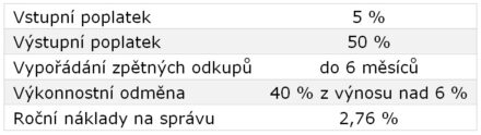 Dopad ročních nákladů na správu fondu byl za uplynulý rok vyčíslen na 2,76 % p. a., což je na poměry investičních fondů relativně vysoké číslo. Nad rámec nákladů na správu je navíc strhávána výkonnostní odměna ve výši 40 % z výnosů nad 6 % p. a. Náklady na správu i výkonnostní odměna jsou ale automaticky již zahrnuty v hodnotě investičních akcií.
