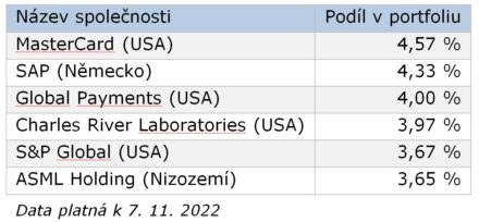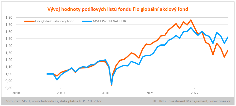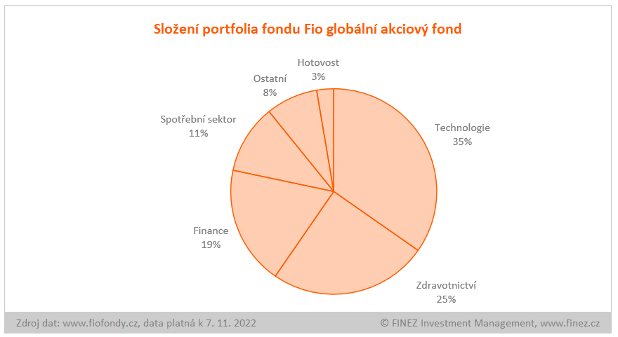Disclaimer: Článek a informace v něm obsažené nejsou investičním doporučením či analýzou investičních příležitostí ani nepředstavují veřejnou nabídku investičních nástrojů ani jakoukoli jinou nabídku či výzvu vůči veřejnosti k transakci s investičními nástroji. Data uvedená v článku pochází z materiálů Fio investiční společnosti. Data k vývoji hodnoty podílových listů a výkonnosti fondu jsou platná k 31. 10. 2022, data o složení portfolia fondu jsou platná k 7. 11. 2022.
