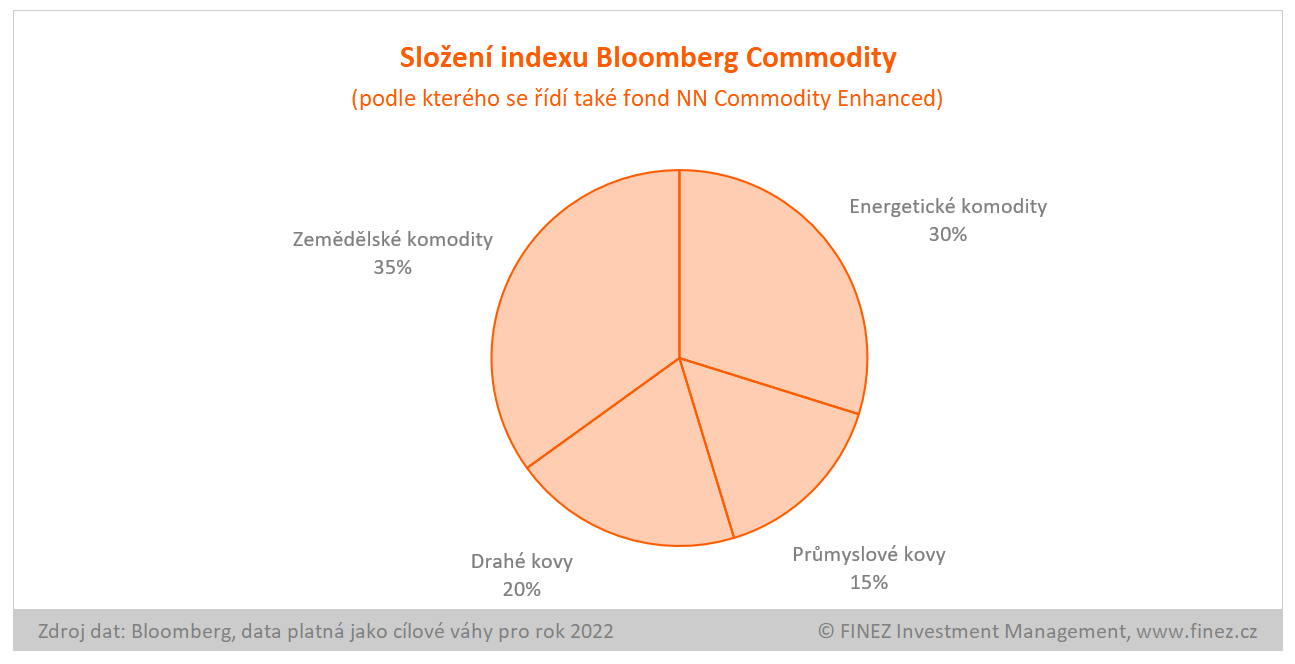 Jak už název napovídá, fond NN Commodity Enhanced je komoditní fond. Rozložením portfolia více méně kopíruje referenční komoditní index Bloomberg Commodity složený z různých komodit obchodovaných na burze. Největší zastoupení v indexu má z jednotlivých komodit ropa a zlato. Celkově je rozumně vyvážený mezi energetické komodity, zemědělské komodity, drahé kovy a průmyslové kovy.