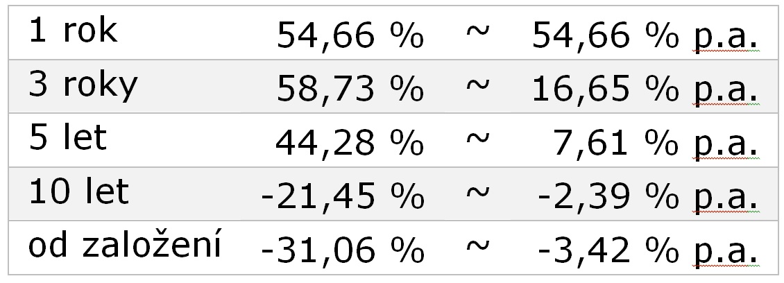 Minimální doporučený horizont pro investici do tohoto fondu je oficiálně 5 let. Dle mého názoru je to ale pro praktické využití nesmysl. Tato investice dává smysl pouze v době, kdy výrazně rostou ceny komodit. Jakmile přestanou růst, začnou se do hodnoty investice negativně projevovat ztráty z rolování termínových kontraktů, což kolikrát udělá 5-10 % za rok.