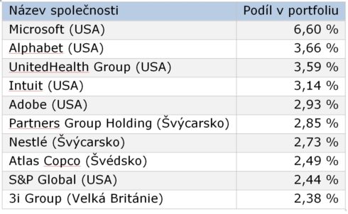Tento fond ale není nijak tematicky vyhraněný, není přímo zaměřen na životní prostředí. Mezi největšími pozicemi v jeho portfoliu tak najdeme například technologické firmy Microsoft, Alphabet, Adobe a Intuit, dále zdravotní pojišťovnu UnitedHealth Group, potravinářskou firmu Nestlé, strojírenskou firmu Atlas Copco nebo společnosti zaměřené na private equity investice Partners Group a 3i Group. Zhruba dvě třetiny portfolia fondu tvoří akcie amerických firem, 30 % evropské společnosti a necelých 5 % asijské firmy.