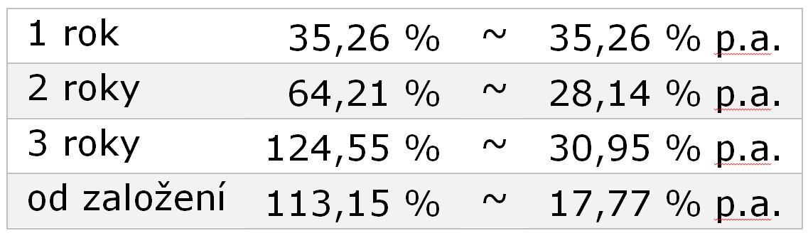Je ale potřeba také upozornit, že historické výnosy nejsou zárukou výnosů budoucích. Věřím, že tento fond bude dlouhodobě vykazovat dobré výsledky, ale výnosy na úrovni kolem 30 % ročně vykazované v posledních třech letech jsou samozřejmě neudržitelné. Mějte realistická očekávání. Dlouhodobě by se výkonností mohl pohybovat lehce nad úrovní indexu MSCI World. Ten pro představu na desetileté periodě vykazuje růst o 10 % p. a.