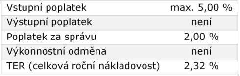 Vstupní poplatek může být dle statutu fondu maximálně 5 %, dle ceníku většiny distributorů se reálně pohybuje kolem 3-5 %. Výstupní poplatek žádný účtován není. Za obhospodařování a administraci fondu si správce automaticky strhává z majetku fondu 2 % ročně, což je hodně. Díky tomu také celkové náklady na správu fondu vychází na 2,32 % ročně. Výkonnostní odměnu si žádnou neúčtuje.