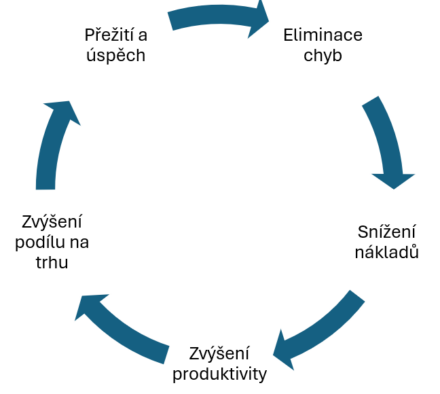 Díky zlepšení kvality se snižují náklady spojené s vadami, přepracováním a stížnostmi. Efektivnější procesy vedou k úsporám a nižším celkovým nákladům. S menším množstvím vad, oprav a přepracování se zaměstnanci mohou soustředit na výrobu více produktů nebo poskytování více služeb za stejný časový rámec, což zvyšuje celkovou produktivitu a konkurenceschopnost.