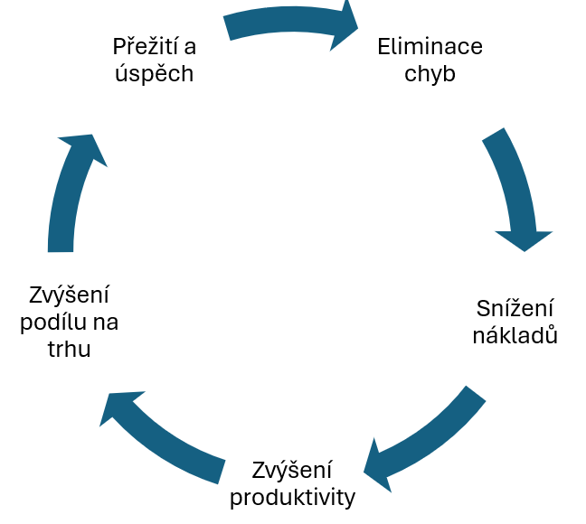 Obrázek 1: Demingova řetězová reakce: Neustálé zlepšování kvality a získávání většího podílu na trhu zajistí dlouhodobé přežití a úspěch v konkurenčním prostředí.