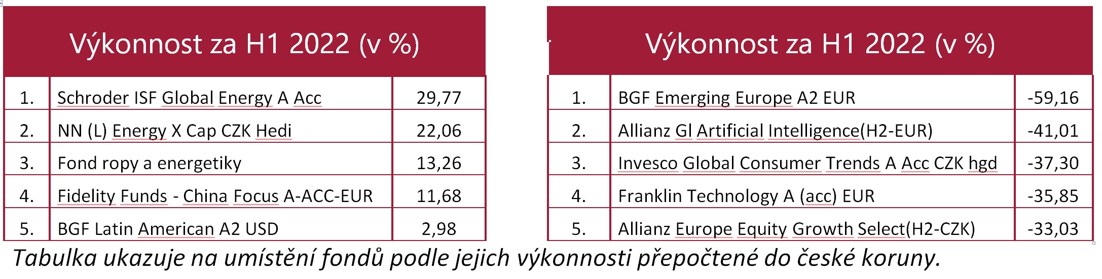 Tabulka: Pět nejvýnosnějších a pět nejméně výnosných fondů za 1. pololetí 2022