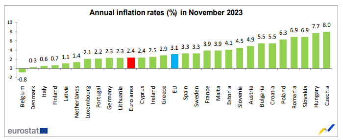 Česká republika vykazovala letos v listopadu vůbec nejvyšší míru meziroční inflace v celé EU. Vyplývá to z dat, která dnes zveřejnil Eurostat. Takzvaná harmonizovaná inflace – tedy inflace srovnatelná napříč unijními zeměmi – dosáhla v listopadu v Česku meziroční úrovně rovných osmi procent. Inflace v Česku tak převyšuje dokonce i inflaci v druhém Maďarsku (viz graf níže). Nejnižší inflaci hlásí Belgie, kde se už ceny dokonce meziročně propadají, a to o 0,8 procenta. Průměr EU pak odpovídá hodnotě 3,1 procenta.