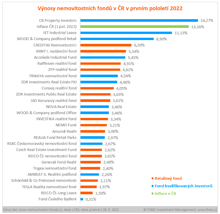 V uvedeném období byly výnosy nemovitostních fondů silně nadprůměrné. Některé fondy již za prvních šest měsíců vykázaly větší výnos, než běžně reportují za celý rok. Nicméně inflaci dokázal porazit pouze jeden fond ze třiceti.