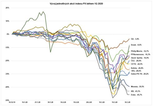 Vývoj jednotlivých akcií indexu PX během 1Q 2020. Zdroj: Fio.cz