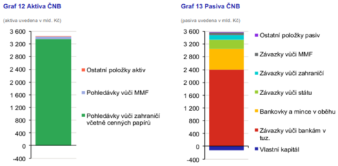 Obrázek 1: Devizové rezervy (v grafu zeleně), jsou aktiva, majetkem ČNB. Financován je emitovanou likviditou (v grafu červeně).