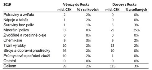 Výbuch ve vztazích mezi ČR a Ruskem bude mít samozřejmě ekonomické dopady. Tabulka níže ukazuje přímé vývozy z ČR do Ruska a dovozy z něj v roce 2019 (před covidem). „Dovozy z Ruska představovaly cca 3 % z celkových dovozů. Nicméně dovozy jsou výrazně vychýlené směrem k surovinám: z Ruska dovážíme cca 38 % všech dovezených surovin. Vysoká závislost na dovozech surovin z Ruska je samozřejmě dlouhodobým bezpečnostním rizikem. Tohle krátkodobě nezměníme, dlouhodobě ano, ale je potřeba na to vyčlenit investiční kapacitu,“ uvádí David Navrátil, hlavní ekonom České spořitelny.