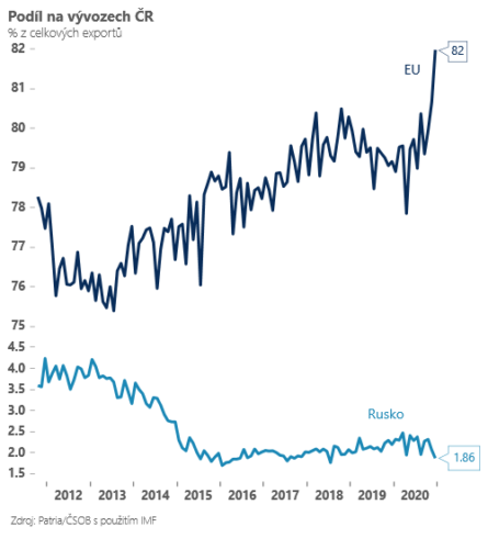 Česko je však na Rusku hospodářsky více závislé než například Velká Británie kvůli dovozu citelného objemu ekonomicky prakticky nezbytných surovin ropy a zemního plynu. Mocný objem dovozu těchto surovin způsoboval v předpandemické éře trvalou zápornou bilanci zahraničního obchodu ČR a Ruska. Loni poprvé minimálně od roku 2005 vykázal český obchod s Ruskem kladnou bilanci, a to z důvodu dramatického poklesu cen ropy a zemního plynu na světových trzích, jenž však byl jen přechodnou záležitostí,“ vysvětluje Lukáš Kovanda, člen Národní ekonomické rady vlády a hlavní ekonom Trinity Bank.