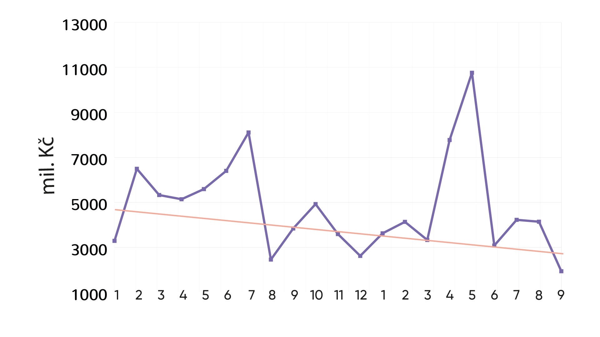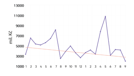 Zářijový objem emisí překvapivě poklesl výrazně pod dlouhodobý trend, když činil jen 1,9 mld. Kč. Obvykle se přitom pohybujeme kolem 4 mld. Kč. Dlouhodobý trend ukazuje, že emise jsou stále menší a menší. To je dáno tím, že přibývá malých emisí.