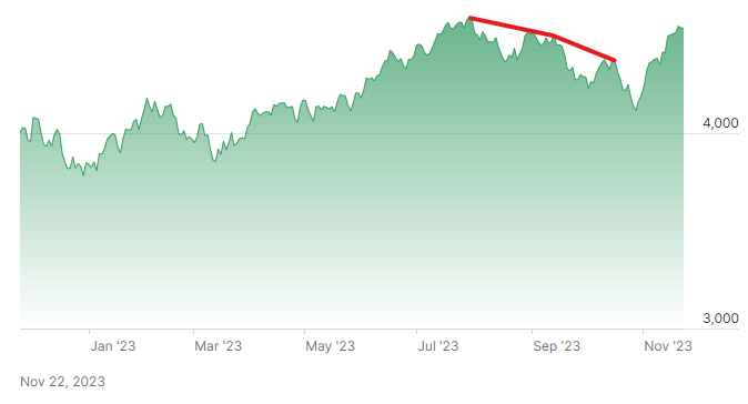 Index S&P 500 v poslední době opět nabral na hodnotě a mohli jsme tak zaznamenat býčí obrat a přiklánět se opět o něco víc k možnosti, že S&P 500 opět vzroste na historická maxima do konce roku 2023 a investoři tedy místo o krachu spekulují o mírné korekci trhu v roce 2024, kdy by se index vrátil opět o trochu níže a potom pokračoval v jeho dosavadním stabilním růstu.