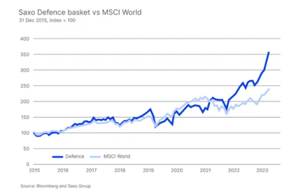 Akcie vojenského průmyslu a zejména evropské zbrojařské firmy se celé roky prodávaly levně a obchodovaly se s velkým diskontem. To se změnilo, když Rusové v únoru 2022 napadli Ukrajinu a výdaje na obranu výrazně vzrostly. Podle Mezinárodního institutu už dosáhly světové výdaje na obranu rekordní úrovně, jaká tu nebyla od studené války, konkrétně 2,2 bilionu USD za rok 2023. Jen v samotné Evropě přesáhly v loňském roce 388 miliard USD a ve Velké Británii mají do roku 2030 dosáhnout 108 miliard USD, tedy 2,5 % HDP. Tento růst výdajů na obranu pomáhá firmám ve vojenském průmyslu navýšit tržby i ceny akcií. Obranný koš Saxo posílil v roce 2023 o 33,2 %, včetně reinvestovaných dividend, zatímco dolarový index MSCI World stoupl jen o 23,8 %. Od svého založení 31. prosince 2015 už náš obranný koš zvýšil svou hodnotu o 257 %, zatímco index MSCI World jen o 139 %.