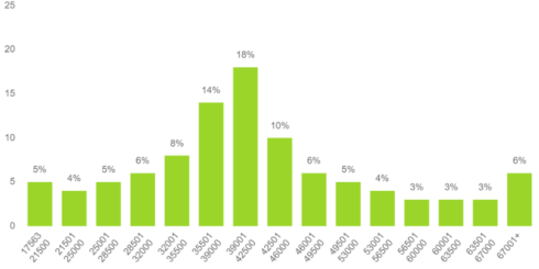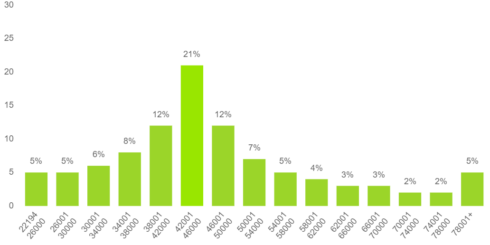 Rozložení zaměstnanců podle celkové (včetně odměn) hrubé měsíční mzdy v Karlovarském kraji. Zdroj: Platy.cz