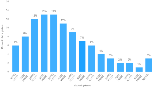 Rozložení zaměstnanců v ČR do mzdových pásem (celková hrubá mzda včetně odměn). Zdroj: Platy.cz