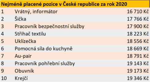 Analýza portálu Platy.cz také ukázala, které pozice byly v roce 2020 nejlukrativnější a které placené nejhůře. Ve spodní části žebříčku se celkem očekávaně nacházejí pozice jako vrátný, šička, pracovník bezpečnostní služby, střihač textilu, uklízečka nebo pomocná síla v kuchyni.