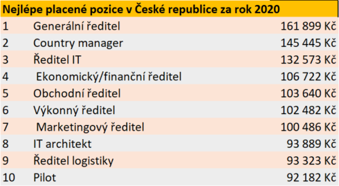Naopak na vrcholu žebříčku jsou především pozice vrcholových manažerů. Nejlépe vydělávají generální ředitelé s měsíční průměrnou mzdou přesahující 160 000 Kč. Z nemanažerských pozic najdeme mezi nejlépe placenými pozicemi například IT architekty nebo advokáty.
