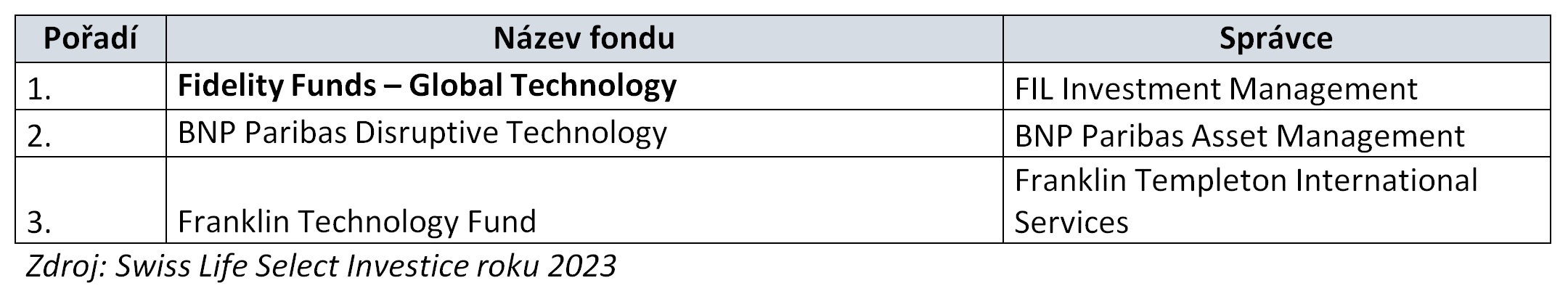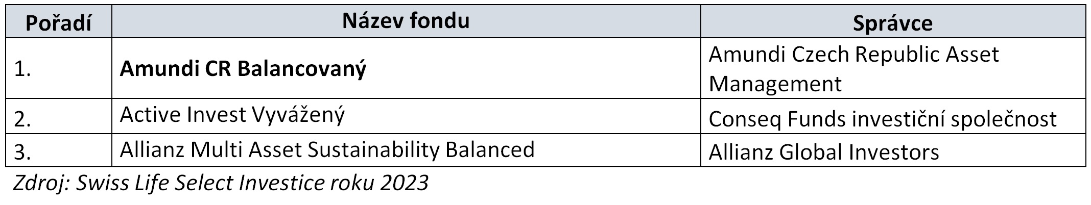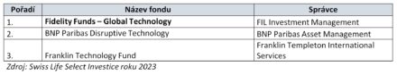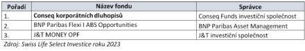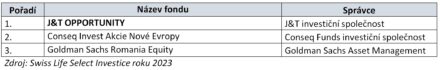 Již počtrnácté proběhlo hodnocení nejúspěšnějších fondů českého investičního trhu – Swiss Life Select Investice roku 2023. Na základě ukazatelů výkonnosti a rizik se na prvním místě v kategorii akciové fondy umístil J&T Opportunity, mezi smíšenými fondy získal první místo Amundi CR Balancovaný, za nejlepší progresivní dluhopisový fond byl vyhodnocen Conseq korporátních dluhopisů a v kategorii Konzervativní fondy zvítězil Conseq Invest Konzervativní. Letos byla soutěž rozšířena o kategorii Trend – technologický fond, kde získal ocenění Fidelity Funds – Global Technology.