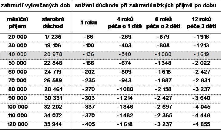 V konkrétním vybraném případu uvedeném v tabulce varianty č. 1, tzn. při výdělku ve výši jedné třetiny ze 40 000 Kč, by se její starobní důchod při péči o 1 dítě snížil o 540 Kč měsíčně. Za 20 let pobírání starobního důchodu by ztráta (vyjádřená v současné hodnotě roku 2023) činila 130 tisíc korun. Při péči o dvě nebo tři děti za stejných podmínek by byla ztráta dvojnásobná nebo trojnásobná.