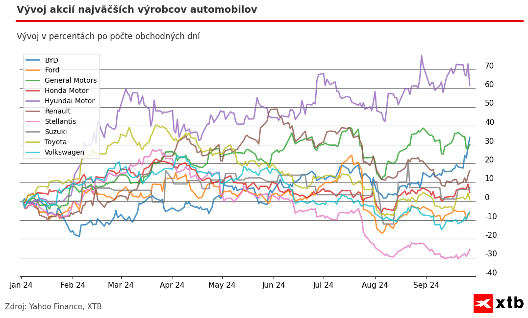 Například společnost Stellantis, která má silné zastoupení v Severní Americe, zaznamenala meziroční pokles prodeje o 15 %. Podobně jsou na tom také značky BMW a Mercedes-Benz, které kvůli vysokému vystavení se čínskému trhu zaznamenávají meziroční pokles prodejů o 6 %. Volkswagen a Toyota v současné době stagnují a jejich růst se blíží nule. Automobilový průmysl, tradičně známý svou cykličností, tak přechází z fáze růstu do fáze vrcholu, po níž následuje pokles.