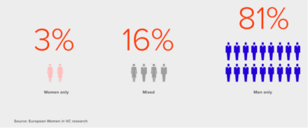 Data ukazují, že pouhá 3 % fondů rizikového kapitálu ve střední a východní Evropě má jako výkonné partnerky pouze ženy. Naproti tomu 81 % fondů je vedeno výhradně muži a 16 % má smíšené týmy generálních partnerů.