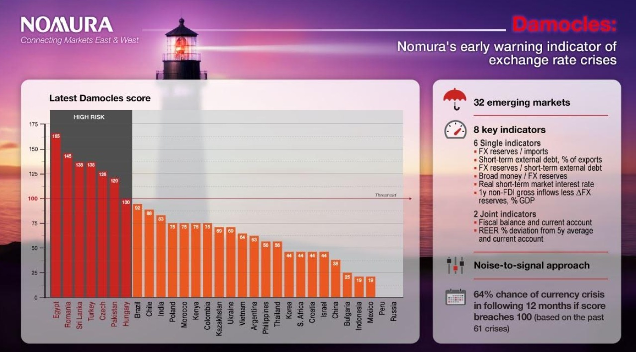 Nomura používá, jak sama říká, systém včasného varování před měnovými krizemi. Pojmenovala jej Damoklés. Na základě ustálené metodiky pravidelně posuzuje takzvané rozvíjející se ekonomiky, mezi něž řadí i Českou republiku. Metodika se opírá o zevrubnou analýzu osmi ekonomických ukazatelů, mezi nimiž je objem devizových rezerv, pokrytí dovozu těmito rezervami a dále třeba výše krátkodobých reálných úrokových sazeb či ukazatele související s rozpočtovou oblastí a s běžným účtem platební bilance.