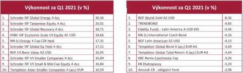 Tabulka: Deset nejvýnosnějších a deset nejméně výnosných fondů za první čtvrtletí roku 2021. Tabulka ukazuje na umístění fondů podle jejich čtvrtletní výkonnosti přepočtené do české koruny.