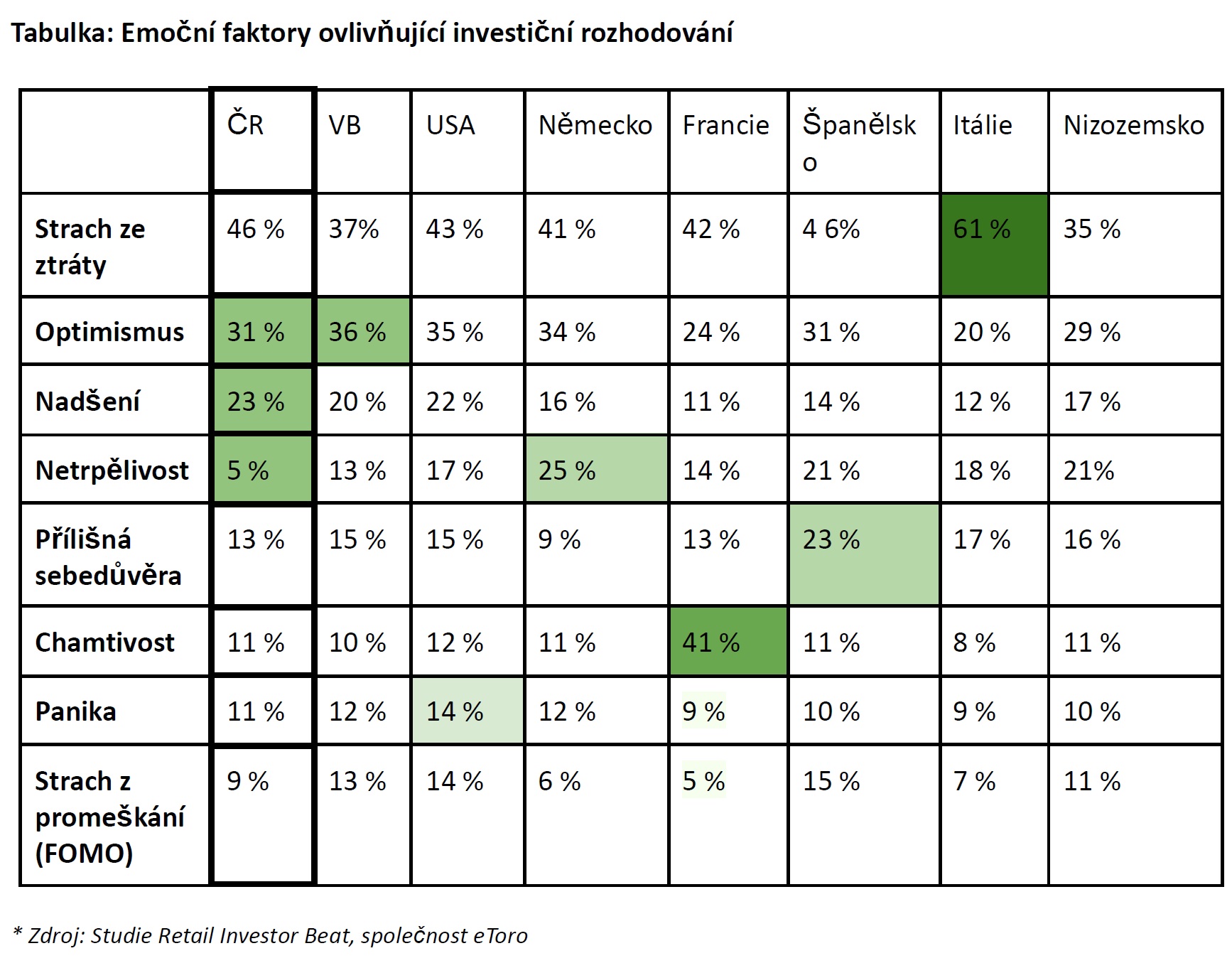 Data rovněž poukazují na geografické rozdíly. Ve srovnání s investory z jiných zemí jsou čeští investoři častěji ovlivněni nadšením (23 %), ale mnohem méně netrpělivostí (5 %). Strach ze ztráty je obzvlášť silný v Itálii (61 %), zatímco britští investoři jsou výrazně ovlivněni optimismem (36 %). Ve Španělsku je nejvyšší podíl investorů motivovaných přehnaným sebevědomím (23 %) a v Německu převažuje netrpělivost (25 %). Ve Francii je největší podíl investorů motivovaných chamtivostí (41 %), přičemž celosvětový průměr činí pouze 14 %.