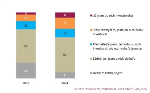 Při porovnání se situací před třemi lety se významně zmenšil podíl respondentů, kteří pojem kryptoměna neznají, a to o 15 procentních bodů. Naopak podíl respondentů, kteří již do kryptoměny investovali nebo o tom přemýšlí, se oproti roku 2018 zdvojnásobil. Jako důvody, proč si investici do kryptoměny rozmysleli, respondenti uváděli riziko, nedůvěru a nestabilitu.