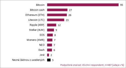 Téměř každý zná bitcoin. Další kryptoměny, jako jsou Ethereum nebo Litecoin, zná přibližně čtvrtina respondentů.