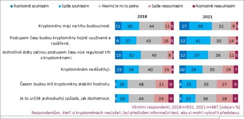 Kryptoměny jsou v prvé řadě vnímány jako měna s velkým potenciálem využití do budoucna, ovšem s vysokou mírou nestability a nedůvěry. Ve srovnání se situací před třemi lety je patrný nárůst jak tendence brát kryptoměny „vážně“, tak i celkového povědomí o nich.