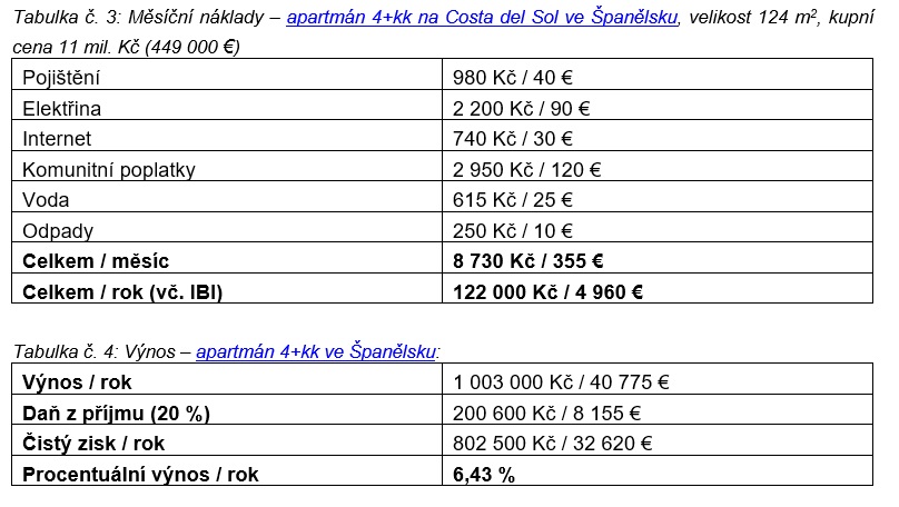 To u apartmánu o dispozici 4+kk a velikosti 124 m2 ve španělském Costa del Sol, jehož cena činí 11 045 000 Kč (449 000 €), se dohromady náklady za měsíc pohybují okolo 8730 Kč (355 €) (viz. tabulka). Čistý roční výnos tu může činit kolem 802 500 Kč (32 620 €), tedy 6,43 %.